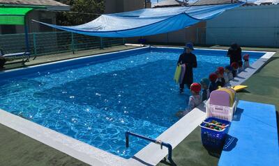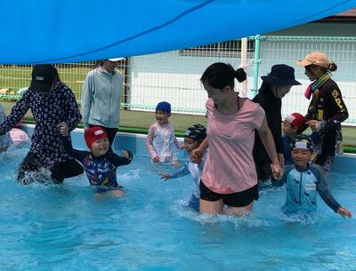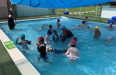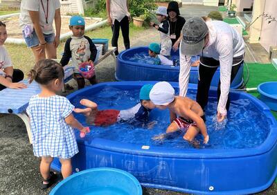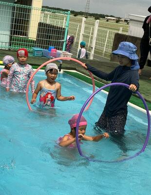 あさば保育園の年長さんが幼稚園に来てくれて、ほし組(年中・年長)さんと一緒にプールに入りました。