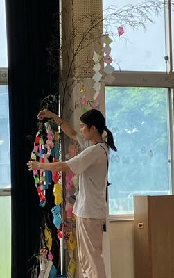 どんな七夕飾りを作ったのか、どんな願い事を書いたのか、について各担任からの紹介がありました。