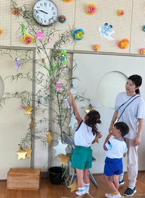 笹に星を飾ることは少し難しく、大きいお兄さん・お姉さんが年少さんを手伝ってくれる微笑ましい姿が見られました。また、チームの友達がゴールするまで、大きな声で応援する姿がとても素敵でした!