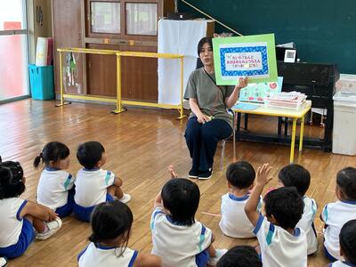 園長先生の話では、1学期の楽しかったことや、大きくなった所を写真付きの紙芝居で教えてもらいました。
