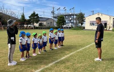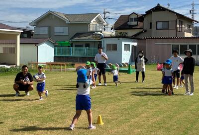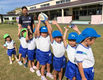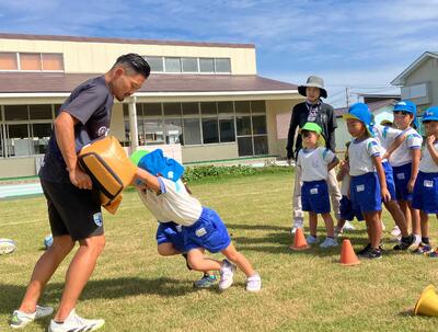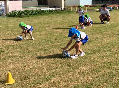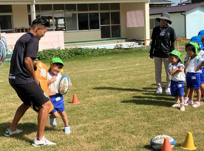 静岡ブルーレヴズからコーチが来てくれて、ほし組さんがラグビー体験をしました。ボールを転がしたり、投げたり、キャッチしたり、持って走ったり、コーチにタックルしたりと、いろいろな体験をしました。レモンのような丸とは違うボールの動きに少し苦戦しながらも、楽しく1時間ラグビーを楽しむ子どもたちの姿が見られました!!