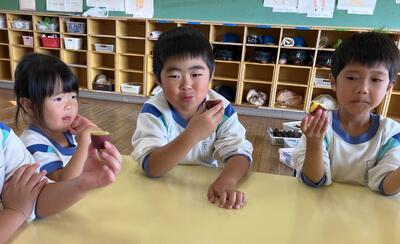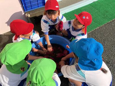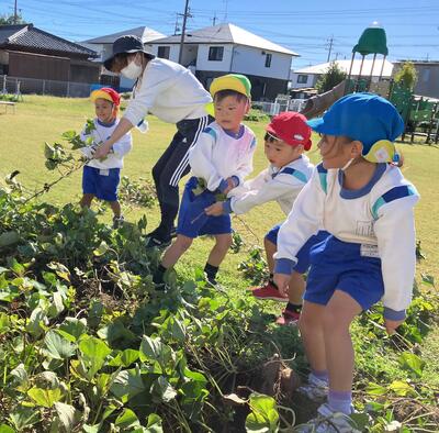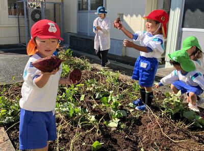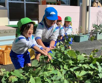 土を掘っていくと、「やったー!取れた!」 「大きいよ!」 「カボチャみたい!」 「おもしろい形だよ!」と収穫を喜びました。みんなで力を合わせてたくさんのサツマイモの収穫ができました。ちょっと残念だったのは、虫に食べられてしまっているサツマイモが多かったこと・・・。なんとか、家に持ち帰るお土産があって良かったです!