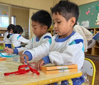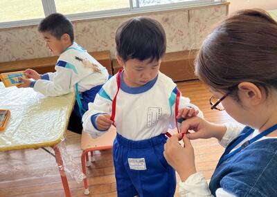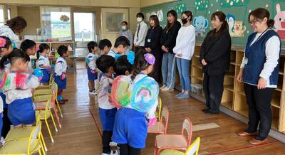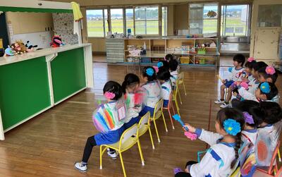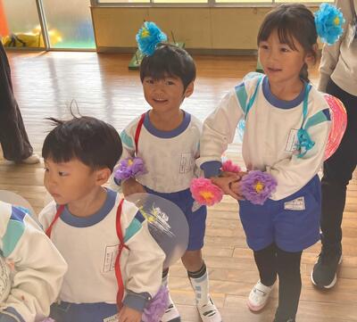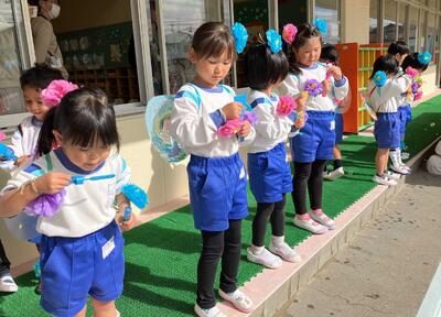 コーナーで遊ぶごとに、かわいい花がもらえました。頭に付けたり腕に付けたり思い思いに楽しみました。そして、3つのコーナーを回ると、ごほうびにシャボン玉をもらいました。夢中でシャボン玉遊びを楽しみました。