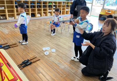 お母さんたちに手伝ってもらいながら、鉄砲で的を狙いました。