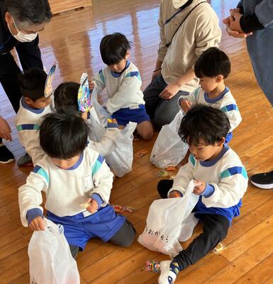 2月3日は節分。幼稚園でも豆まき会が行われました。朝から「鬼が来る、怖いよ~」と言っていた子どもたちでしたが・・・果たしてどうだったでしょうか?