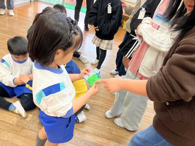 みんなで遊んだ後は、日頃楽しんでいる遊びをしました。カードゲームや転がしドッジ、ボールキャッチなど、ほし組さんのやりたい遊びを一緒にしてくれました。優しく遊んでくれるお兄さん・お姉さんとの遊びの時間はあっという間でした。