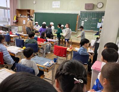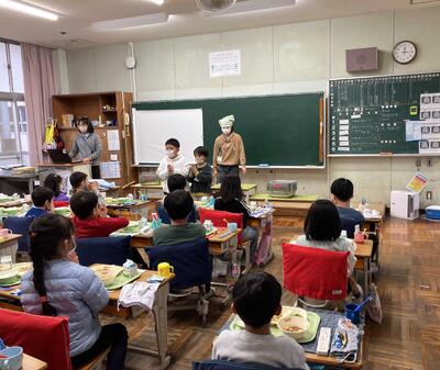 授業が終了する12時から、1年生の給食準備の様子を参観させてもらいました。