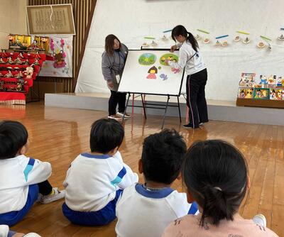 職員が「ひなまつりの由来」についてのパネルシアターをしたり、ひな祭りクイズをしたりしました。