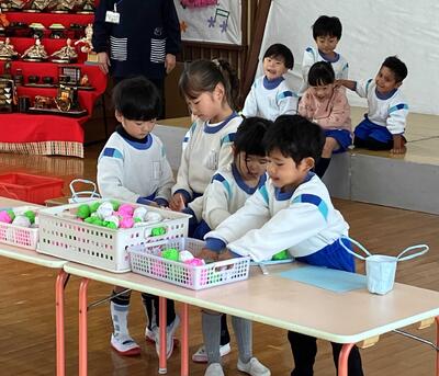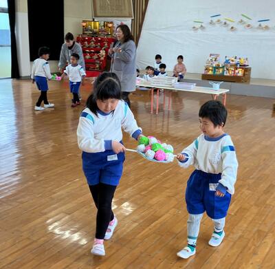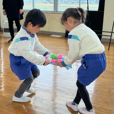 「ひなあられ(折り紙で巻いたボール)運びゲーム」も行いました。会に向けて、少しずつ子どもたちとボールを作っていて、どんなゲームだったら楽しいのか遊びながら当日を迎えました。引いたカードの道具(バック・うちわ・紙)を使って、ペアの子と協力して運ぶゲームで、チーム対抗で早さとボールの数を競いました。ペアのお兄さんやお姉さんがリードしながら早くたくさん運ぼうとする姿が見られ、白熱したゲームとなりました!!(2回戦行った結果は・・・・・是非、お子さんにどうなったのか聞いてみてください!)