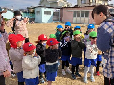 2月3日は節分。幼稚園でも豆まき会が行われました。朝から「鬼が来る、怖いよ~」と言っていた子どもたちでしたが・・・果たしてどうだったでしょうか?