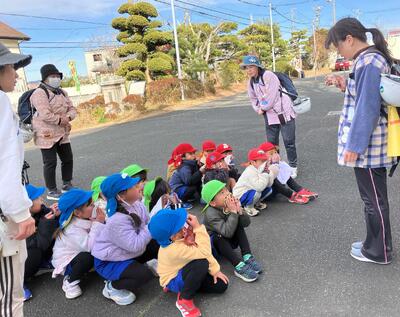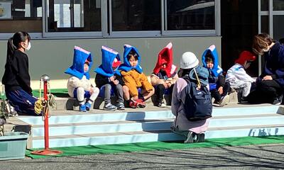 乾燥しているこの時期、火事の際にどう自分の身を守ったら良いか、以前行ったスモーク体験を思い出し、鼻や口を押えて低い姿勢になることを改めて学びました。泣く子もおらず、教師の話を真剣に聞いて避難する姿に成長を感じました。