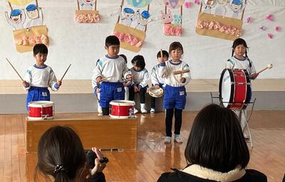 年長さんは、太鼓やウッドブロック、大太鼓を使って「ミッキーマウスマーチ」を演奏しました。大太鼓の音をよく聞いて、リズムを合わせて演奏する姿が見られました。ハンドベルでは、「きらきらぼし」を演奏しました。緊張の面持ちでしたが、きれいな音を響かせてくれました。楽器演奏を通して、楽器の使い方を知ったり、音楽に合わせて鳴らしたり叩いたりする楽しさを感じることができました。