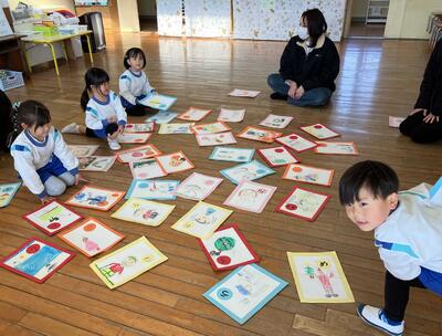 年中さんは、子どもたちが作ったかるたを使って、子ども対大人でかるた取り対決をしました。気合十分で友達と取り合いをするくらい一生懸命に取り、子どもチームの圧勝でした。