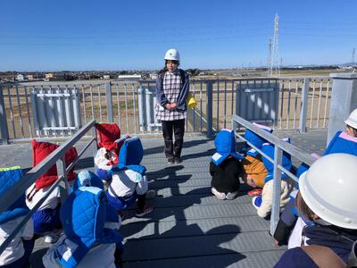 園長先生の放送を聞き、「地震が来た」ことを知った子どもと職員でしたが、毎月の訓練の成果もあり、慌てることなく泣く子もおらずスムーズに避難することができました。しかし、人数の点呼をしたところ、職員が1名いないことに気付きました。そこで、ほし組の担任とフリーで不明者の職員を探しに行くことにしました。子どもたちは、クラスの先生がいない中でしたが、他の先生の話を聞いて、きらりんタワーに避難することができました。不明者の職員も無事見付けることができ、その後タワーに避難することができました。